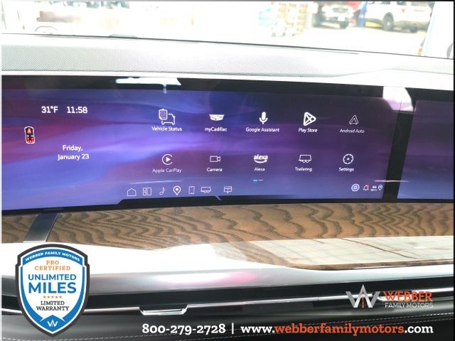 The Onyx Package further enhances the Escalade's striking appearance, with gloss black accents, 22-inch forged alloy wheels, and a black illuminated Cadillac emblem. Paired with the stunning Crystal White Tricoat exterior, this SUV exudes an elegant and commanding presence on the road.